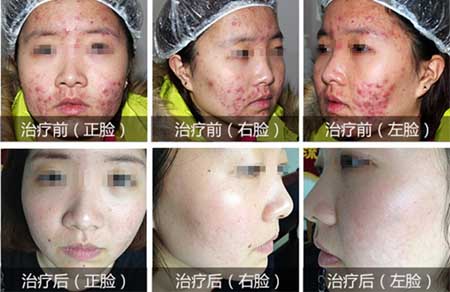 【专家分析】患者由于痤疮初期没有得到正规治疗,几乎到了毁容的地步。由于病情严重,到院后 专家进行了心理疏导,另组织了皮肤科专家集体会诊,为其定制了一系列拔痘根、平痘印、受损肌肤修复,经过2个月治疗,后续追踪半年 ,无复发迹象。