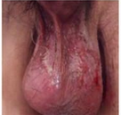 由急性阴囊湿疹转变而来,表现为阴囊皮肤轻度变厚和轻度糜烂,鳞屑较多,渗液甚少,仍有剧烈瘙痒。